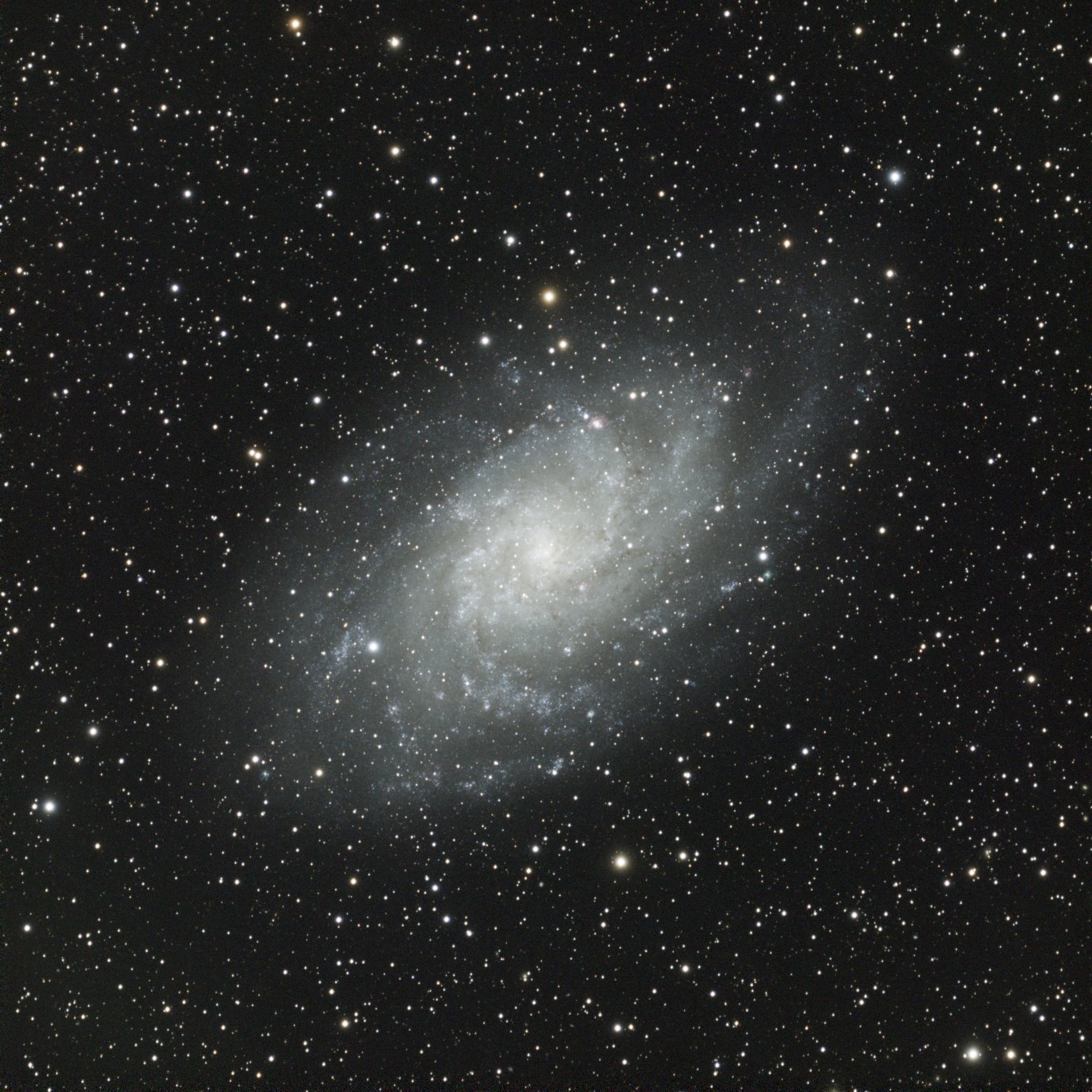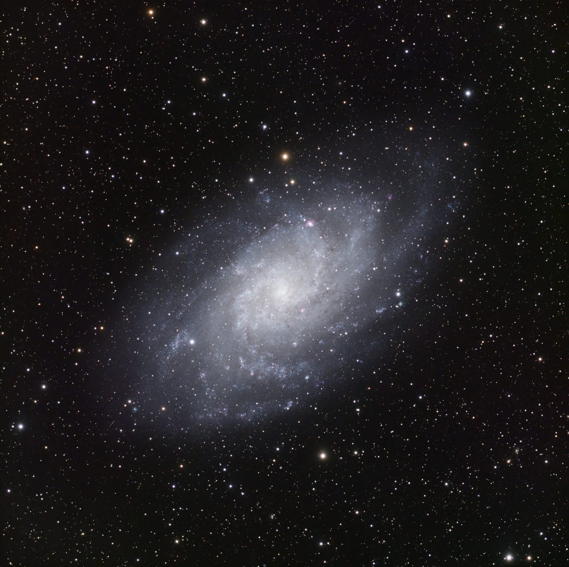 M33, the Triangulum galaxy, 300 s exposures totaling 5.9 h with Astro-Tech AT65EDQ and ZWO ASI533MC, iOptron CEM40, and Astro-Tech AT65EDQ. Full size