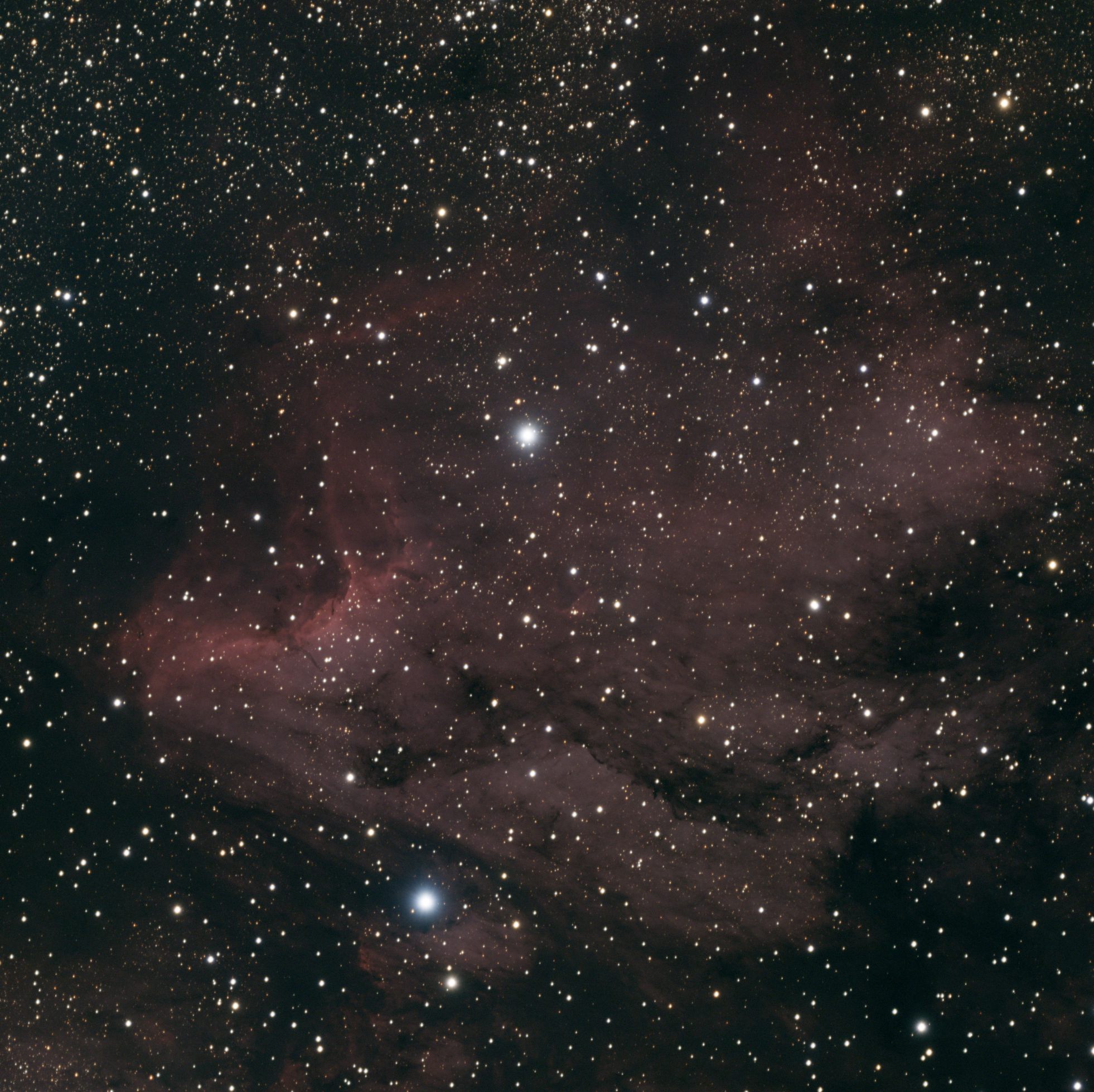 The Pelican Nebula, 300 s exposures totaling 3h25m with Astro-Tech AT65EDQ and ZWO ASI533MC, iOptron CEM40, and Astro-Tech AT65EDQ. Full size